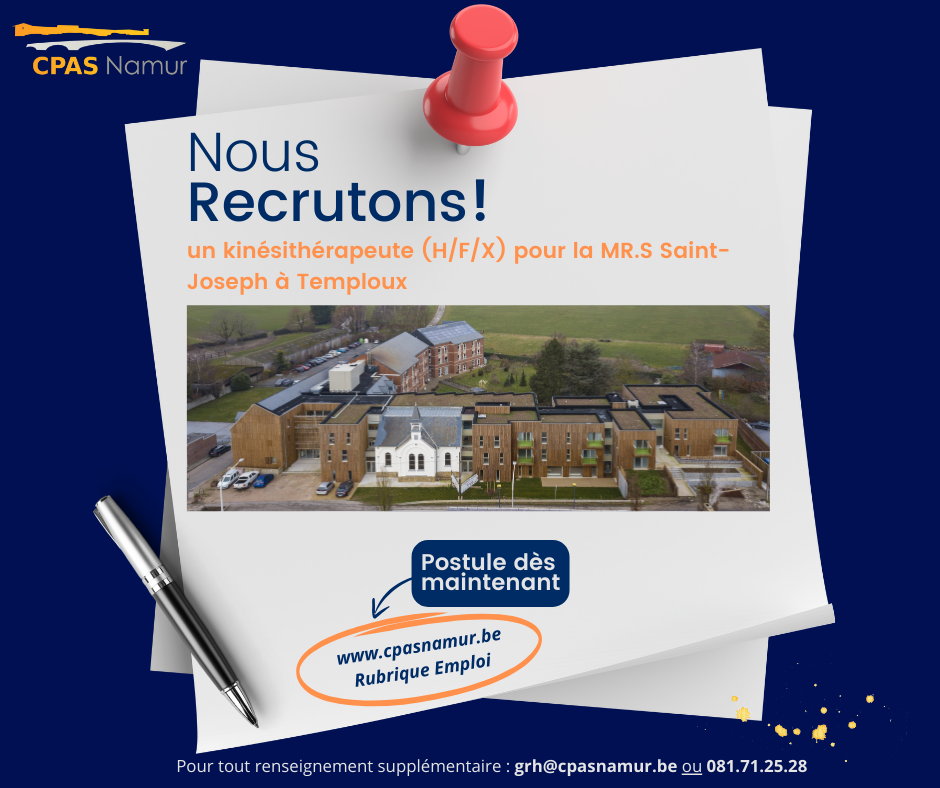 Le CPAS de Namur recherche un kinésithérapeute pour la MR.S Saint-Joseph (H/F/X) - Contrat de remplacement à ½ ou ¾ temps